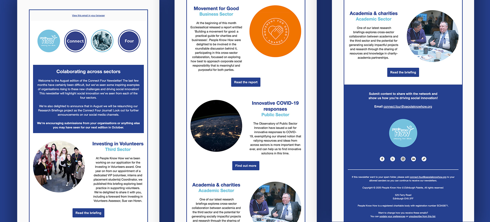 The Connect Four webpages on the People Know How website are interactive and innovative to reflect the theme of the event and the visual identity. They bring together information about events with collation of findings from past events.