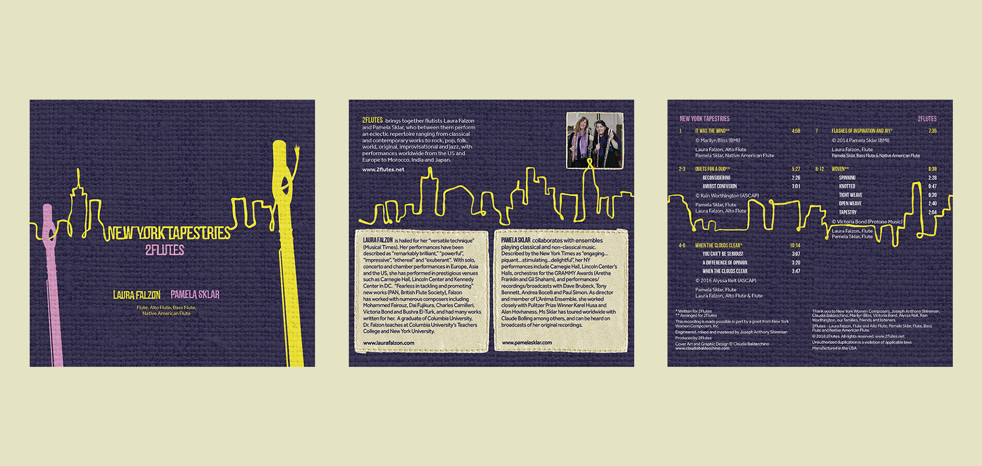 The CD is designed to reflect this, using fabric textures and typography that envisions the two flutes as needles, weaving and entwined with New York City’s skyline.