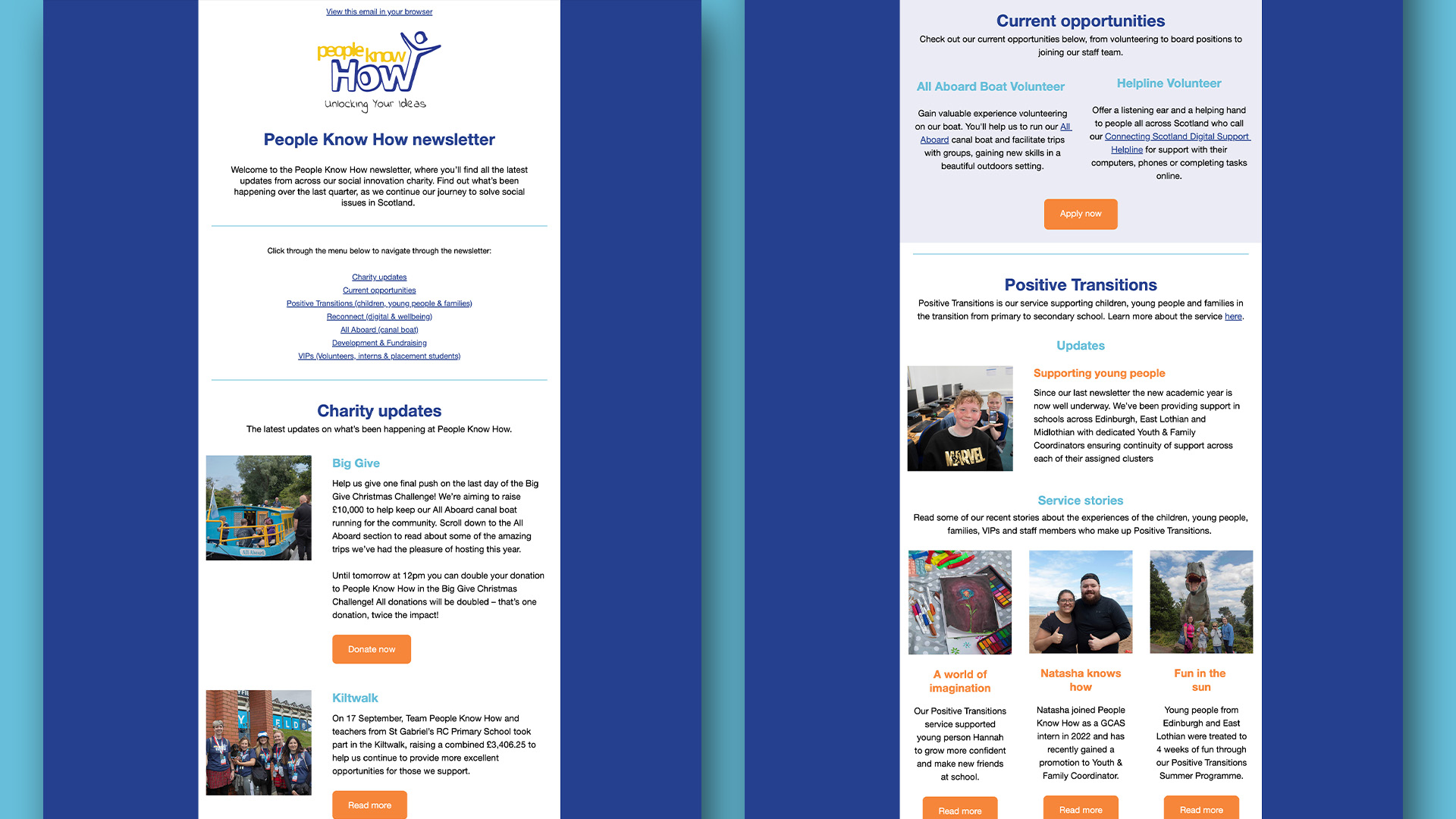 Branding, website design and development, editorial design, social media campaigns, video editing, and communications for charity People Know, developed with a Communications & Marketing Strategy also created for the organisation.