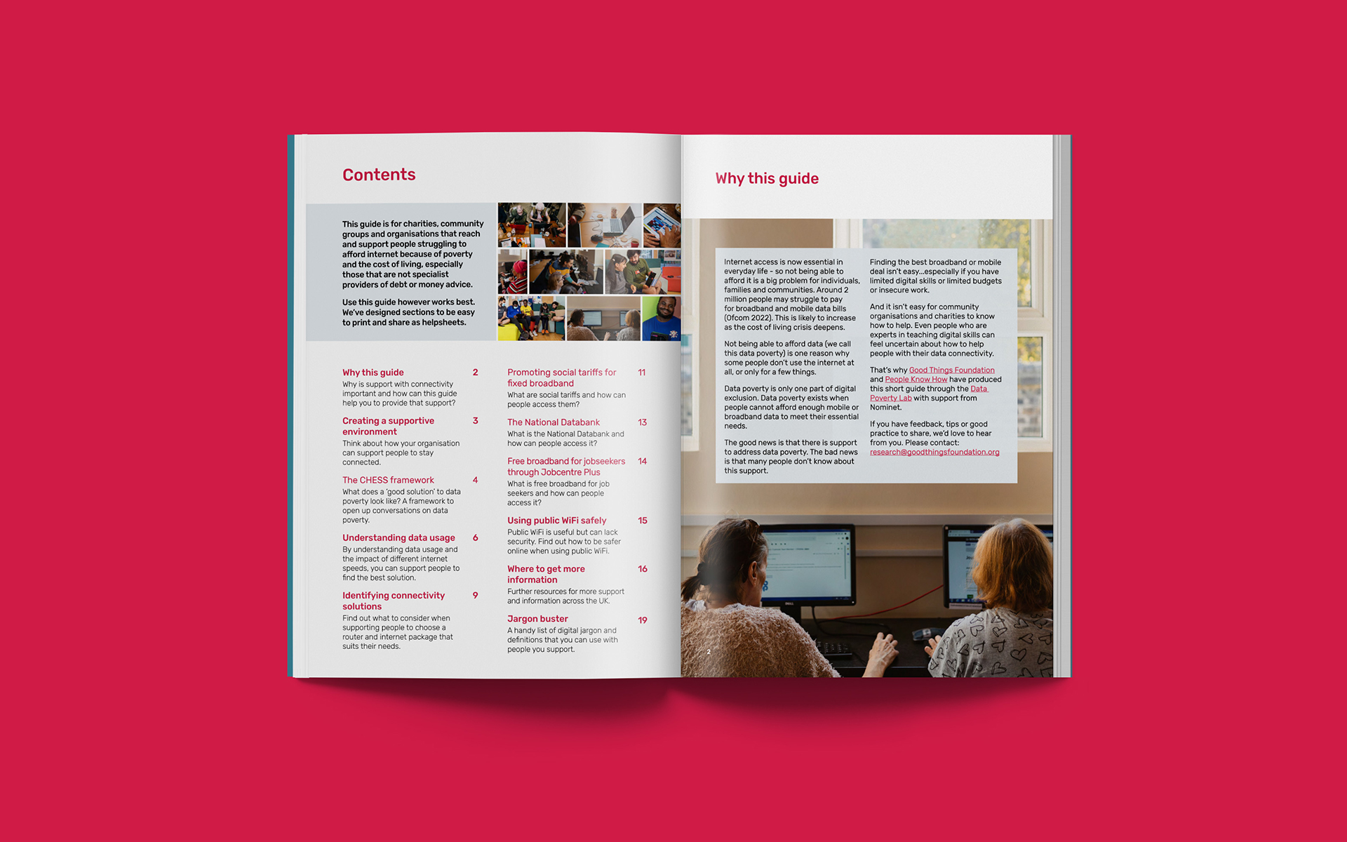 Publication, editorial design and copywriting for international charity Good Things Foundation, designing and illustrating a guide providing information to organisations that support people with data connectivity.